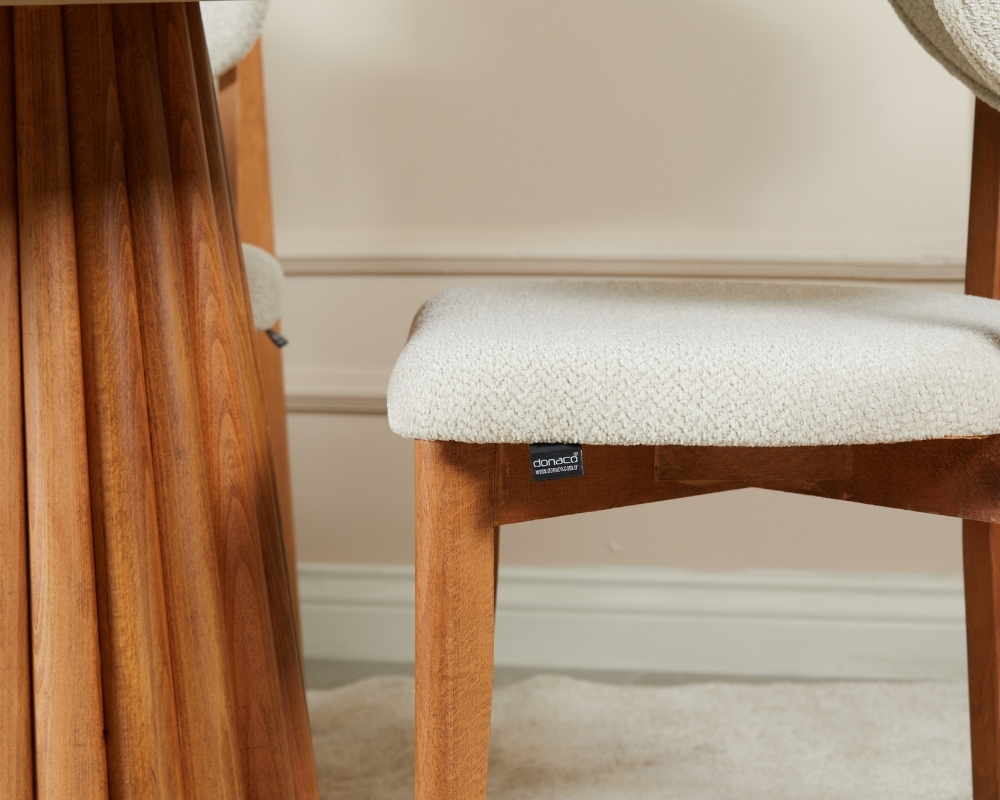 Görselde görüldüğü gibi, Somera Sabit Masa Takımı, ceviz kaplama MDF masası ve sağlam gürgen ayakları ile zarif bir görünüm sunar. Sandalyelerdeki hazeran sırt detayları, hem modern hem de klasik dekorasyon tarzlarına uyum sağlayarak doğal ve İskandinav bir hava katıyor. Papel oturma alanı ve sırt kısmı, uzun oturumlar için konfor sağlarken, dayanıklılığı ile de uzun ömürlü kullanım vaat ediyor.
