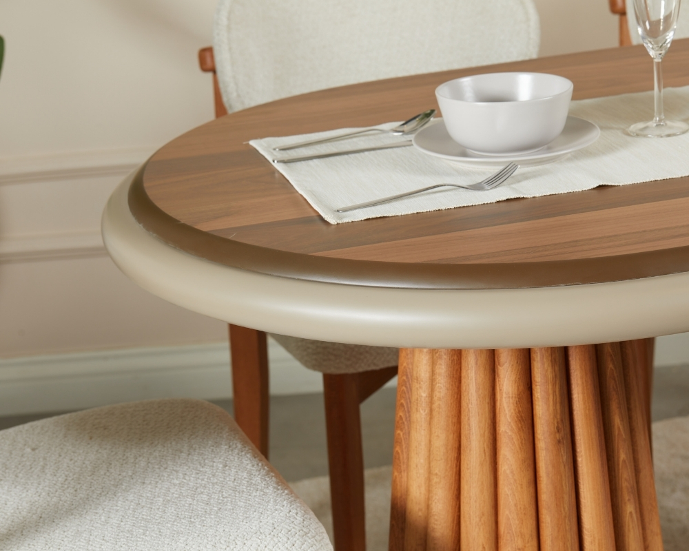 - Modern ve Şık Tasarım: Somera Sabit Masa Takımı, ceviz kaplama MDF masası ve gürgen ayakları ile zarif ve modern bir görünüm sunar. Sandalyelerdeki orta boyutlu yapısı, takımın estetiğine benzersiz bir dokunuş katarak, hem modern hem de klasik dekorasyon tarzlarına uyum sağlar.